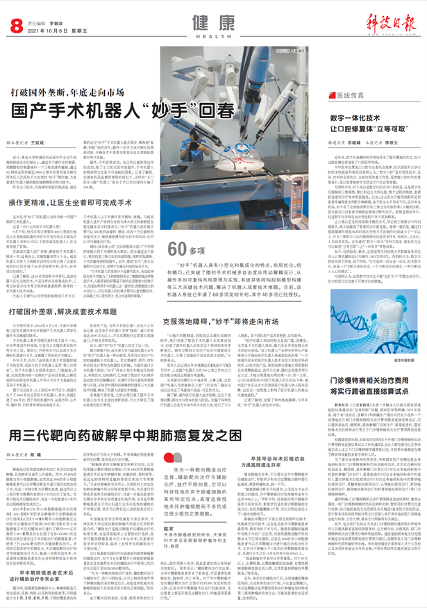 最终,手术获得成功。而之所以能取得这样的成功,除了主刀医生医术高超外,手术机器人的精准得力也是不可或缺的因素。记者了解到,在国家药品监督管理局的授权下,这样的“主刀医生+国产机器人”组合手术已经在国内实施了168例。