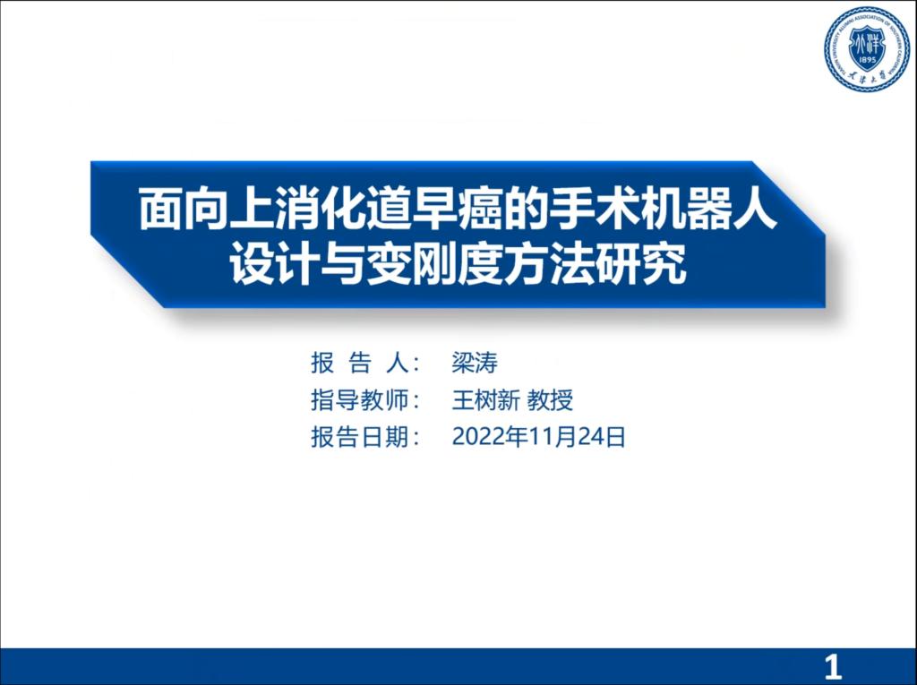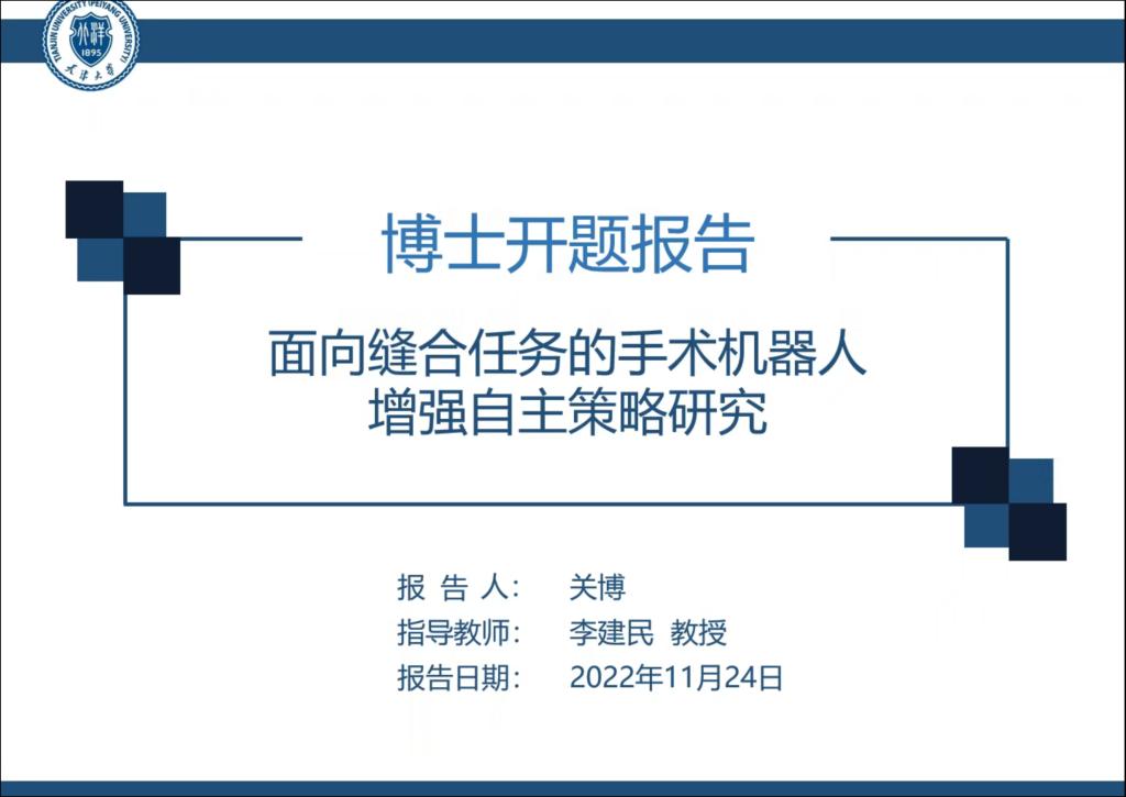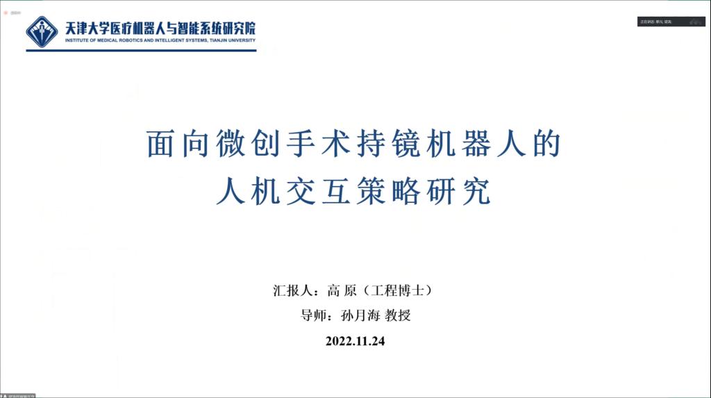 2022年11月24日,天津大学医疗机器人与智能系统研究院(IMRIS,以下简称研究院)博士研究生开题答辩在研究院三层会议室正式举行。此次开题,由智算学部魏建国教授、自动化学院高忠科教授、材料学院原续波教授及机械工程学院孙月海教授、潘立志副教授、李进华副教授、邢元副教授等七位不同领域专家共同审核指导。应疫情防控政策要求,评审专家和各位开题答辩博士生采用线上会议的方式进行,由邢元老师主持,研究院及学校各级研究生线上旁听评审会。