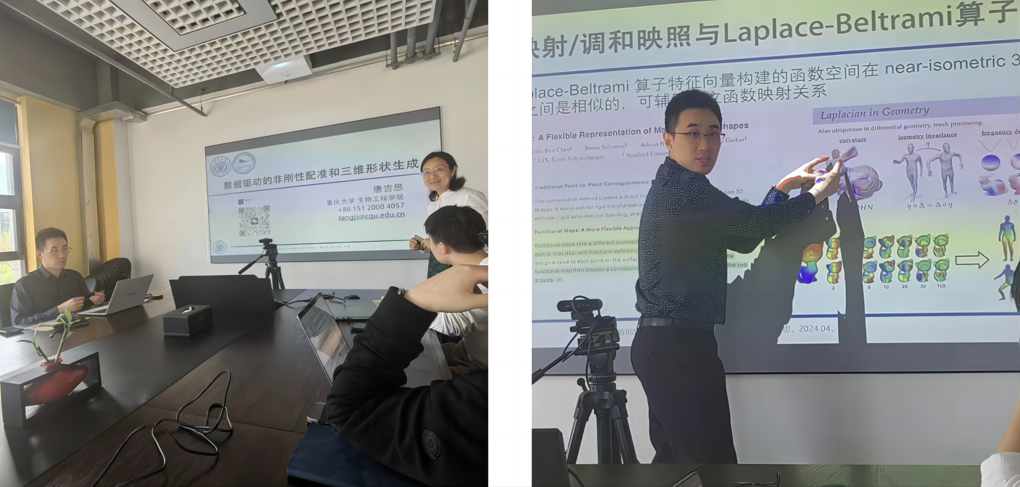 2024年4月18日,为帮助同学们了解配准技术与膝关节运动轨迹预测相关领域的最新进展、理论、实践和前沿知识,拓展大家的视野,加强学术能力。天津大学医疗机器人与智能系统研究院(以下简称研究院)在综合服务中心301会议室分别于当日上午和下午举办了《数据驱动的非刚性配准和三维形状生成》与《几何诱导的膝关节屈曲运动轨迹推演》两个讲座,会议邀请了重庆大学生物工程学院副教授,清华大学博士后唐吉思老师进行了主题汇报,由研究院共性技术平台负责人邢元老师主持。 ![]()