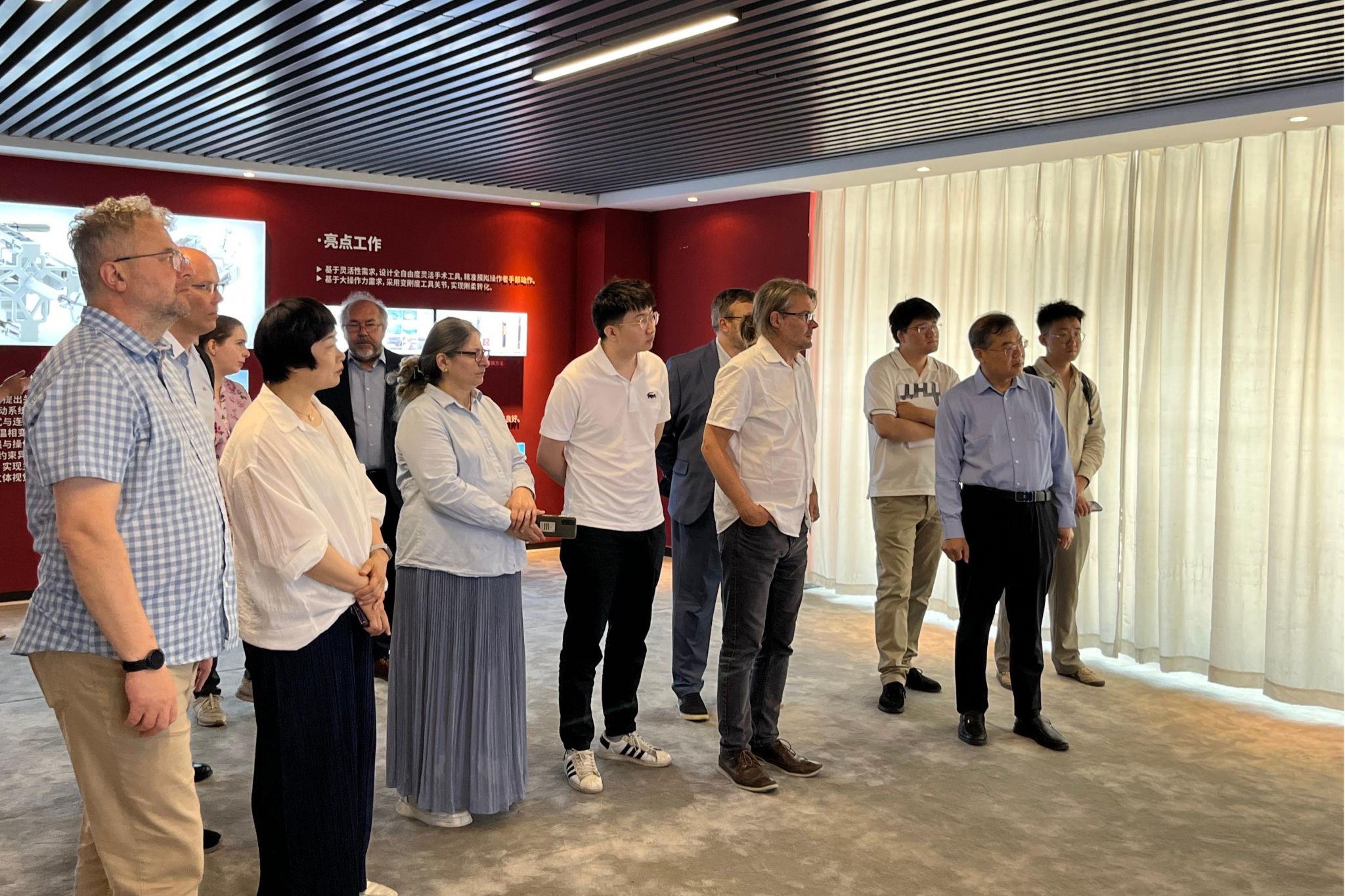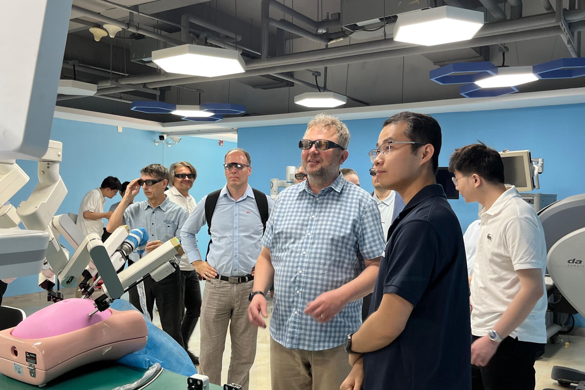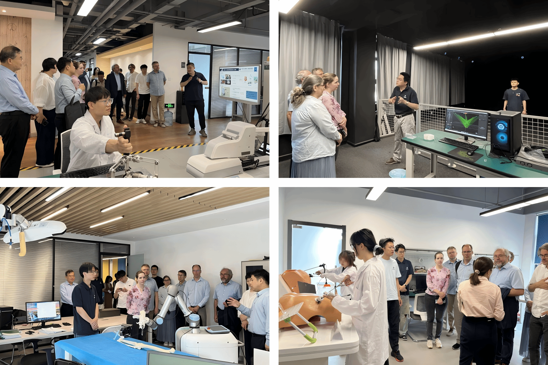 中欧专家代表团一行首先参观了研究院科技展厅,深入了解天大团队在手术机器人领域的科研创新历程。在机器人总装工作间,代表团近距离观摩和体验了团队自主研发的妙手手术机器人系统的三维立体成像和精准主从控制,更加直观深刻地体会到手术机器人的技术特点和优势。