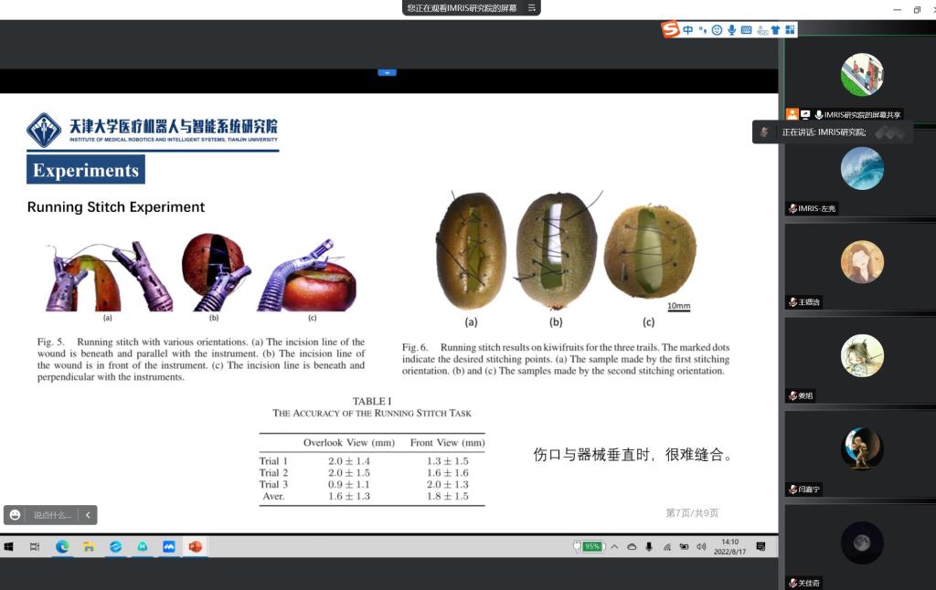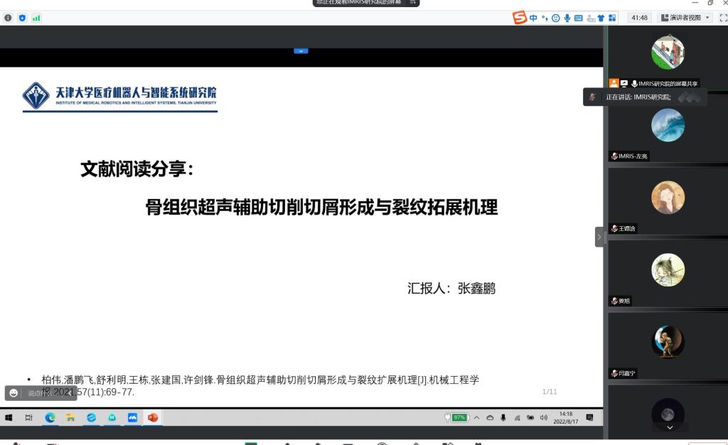 8月17日,天津大学医疗机器人与智能系统研究院2022年第七期研究生阅读报告分享会在研究院306会议室举行。研究院副院长左亮,共性技术平台负责人邢元以及研究院2021级全体博士生和硕士生现场参加会议,研究院2022级全体博士生和硕士生通过腾讯会议的方式参加会议。