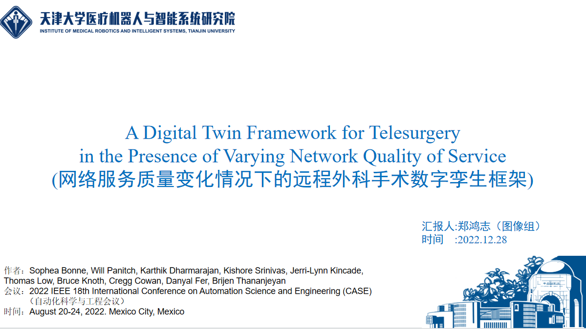 首先,由郑鸿志进行题为《A Digital Twin Framework for Telesurgery in the Presence of Varying Network Quality of Service》的报告分享: