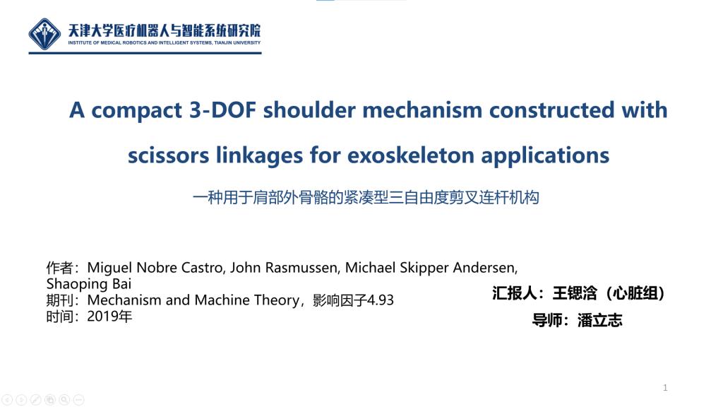 最后由王锶浛进行题为《A compact 3-DOF shoulder mechanism constructed with scissors linkages for exoskeleton applications》的报告分享: