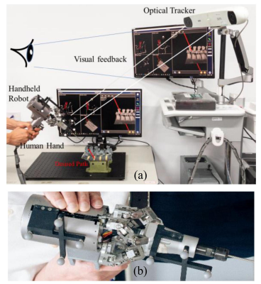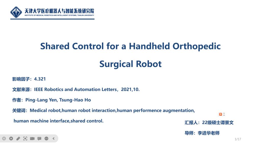 谭景文同学介绍了2021年10月的一篇IEEE Robotics and Automation Letters 的一篇文章,带有嵌入式平行运动学机械手(PKM)的手持式机器人体积小巧,在抑制震颤和运动稳定方面特别有优势。在嵌入式机器人的补偿动作过程中,如果由于不期望的运动而导致偏差过大,执行机构很容易达到其工作边界。机器人驱动产生的反射力也会污染操作者的触觉。本文提出了一种带有基于手柄的导航人机界面(HMI)的共享控制。设计了一个引导姿势区域,以满足PKM的灵巧度最大化和动能最小化这两个指标。手持机器人由人类控制握住进入引导姿势区域的手柄,以及由PKM来定位工具和消除人类的颤抖,与传统的基于工具的人机界面合作控制下的手持机器人相比,共享控制下的手持机器人在工具跟踪精度和减少力的伪影方面都有很大的提高,而且没有间断性停顿。