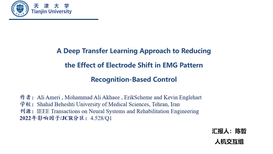 之后,陈哲同学分享了《A Deep Transfer Learning Approach to Reducing the Effect of Electrode Shift in EMG Pattern Recognition-Based Control》: