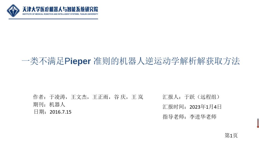 最后,于跃同学对论文《一类不满足Pieper 准则的机器人逆运动学解析解获取方法》进行了分享: