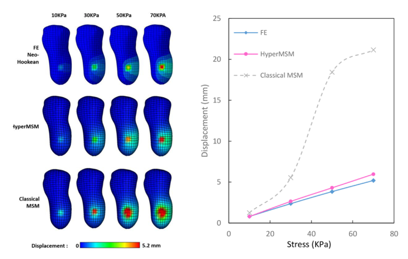 本文分别进行单轴拉伸实验、弯曲实验、扭转实验验证HyperMSM模型与有限元模型的相关性。为了验证实际应用效果,对经胫骨残肢模型和右腰肌的肌肉模型进行分析,发现模型具有较好的可行性。但该模型也存在一些问题,如该模型仅适用于泊松比大于0.4的Neo-Hookean固体,对于其他高阶超弹性模型有一定的误差。针对其应用还需要根据实际情况进行考虑。