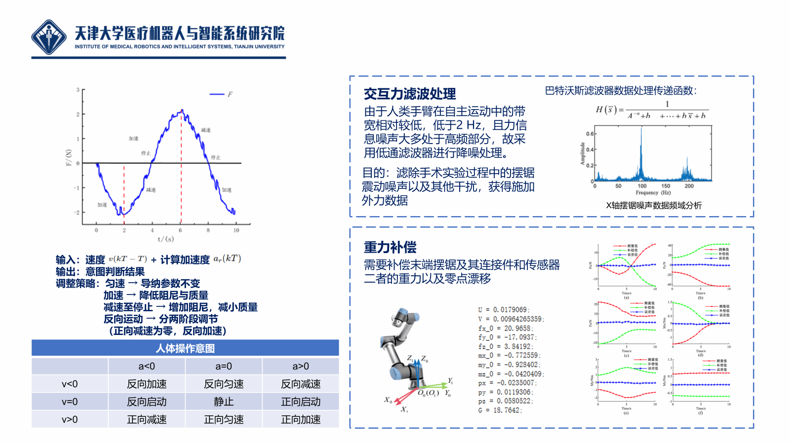 在操作意图感知方面,完成了六维力信号低通滤波与重力补偿算法实现,可有效滤除摆锯高频振动噪声,消除末端负载与零点漂移干扰,精准提取医生真实操作力。在柔顺控制算法方面,搭建二输入二输出模糊变导纳控制框架,以运动速度、加速度为输入,实时输出自适应虚拟阻尼与质量;引入梯度下降法在线优化模糊映射规则,显著提升不同工况下的柔顺性与鲁棒性。基于短时傅里叶变换与带通滤波,实现摆锯95–100Hz特征频段能量检测,完成开机/关机状态实时识别,自动切换阻尼参数,兼顾自由拖动轻便性与截骨操作稳定性。对比实验表明,优化后的模糊变导纳控制在交互力波动、运动平稳性、能量消耗等指标上均优于定导纳方案,系统响应更平滑、操作更省力。