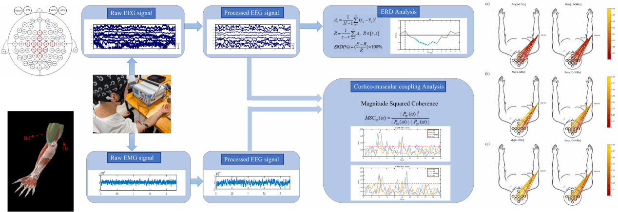 为解决上述问题,研究人员构建了叠加功能性电刺激(FES)与运动想象结合的康复训练新模式。首先在受试者进行运动想象任务时,同步对目标肌肉施加FES刺激,以诱发被动肌肉收缩并产生本体感觉反馈,再通过采集脑电与肌电信号,计算幅值平方相干性(MSC)和皮层事件相关去同步特征,最后利用显著相干面积(SCA)定量分析皮层-肌肉耦合程度的差异。该研究表明,受试者在FES辅助下的运动想象不仅显著提升了皮层与肌肉的耦合强度,还成功重建了感觉运动的神经闭环通路。