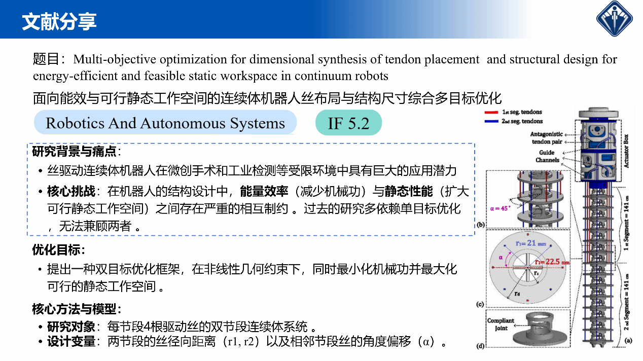 研究院2024级硕士研究生梁峰川进行了题为《面向消化道手术的柔性器械设计与摩擦补偿研究》的报告分享。关于连续体机器人多目标优化的最新研究指出,丝驱动连续体机器人在微创手术等领域极具潜力,但结构设计上面临能量效率与静态性能相互制约的核心痛点。为此,研究团队提出了一种双目标优化框架,以每节段4根丝的双节段系统为对象,选取丝径向距离及相邻节段角度偏移作为核心设计变量。