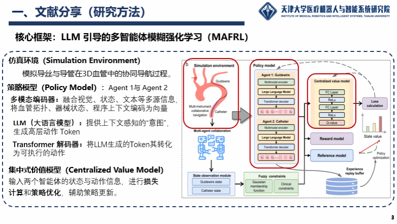 研究院2025级博士研究生马连波进行了题为《机器人辅助血管介入手术术中智能决策系统研究》的报告分享。血管内介入手术中为导航复杂的血管解剖结构,需要对导丝、导管等多种器械进行精准协同控制。基于学习的方法通常局限于单器械控制,无法满足需要多器械协同的复杂临床场景。
