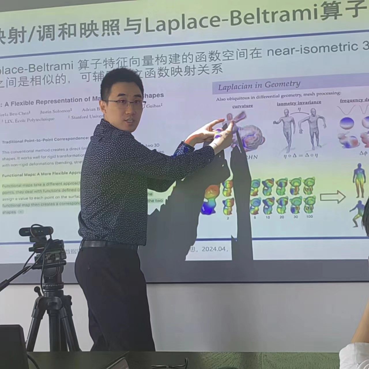 上午的报告,唐老师从自监督学习和自编码预训练的角度出发,联系三维非刚性配准方法和随机形状生成模型,突出了数学、理论力学、弹性力学等各个学科交叉融合的重要性。同时就非刚性配准与组织材料力学特性识别、掩盖自编码预训练与骨折定位修复与研究院智能骨科中心的同学进行了激烈的交流讨论。唐老师引导大家,思考非刚性配准在机器视觉、数字孪生、大模型与生成式人工智能研发应用的研究展望,鼓励大家结合自身的研究方向,进行辩证性交流。
