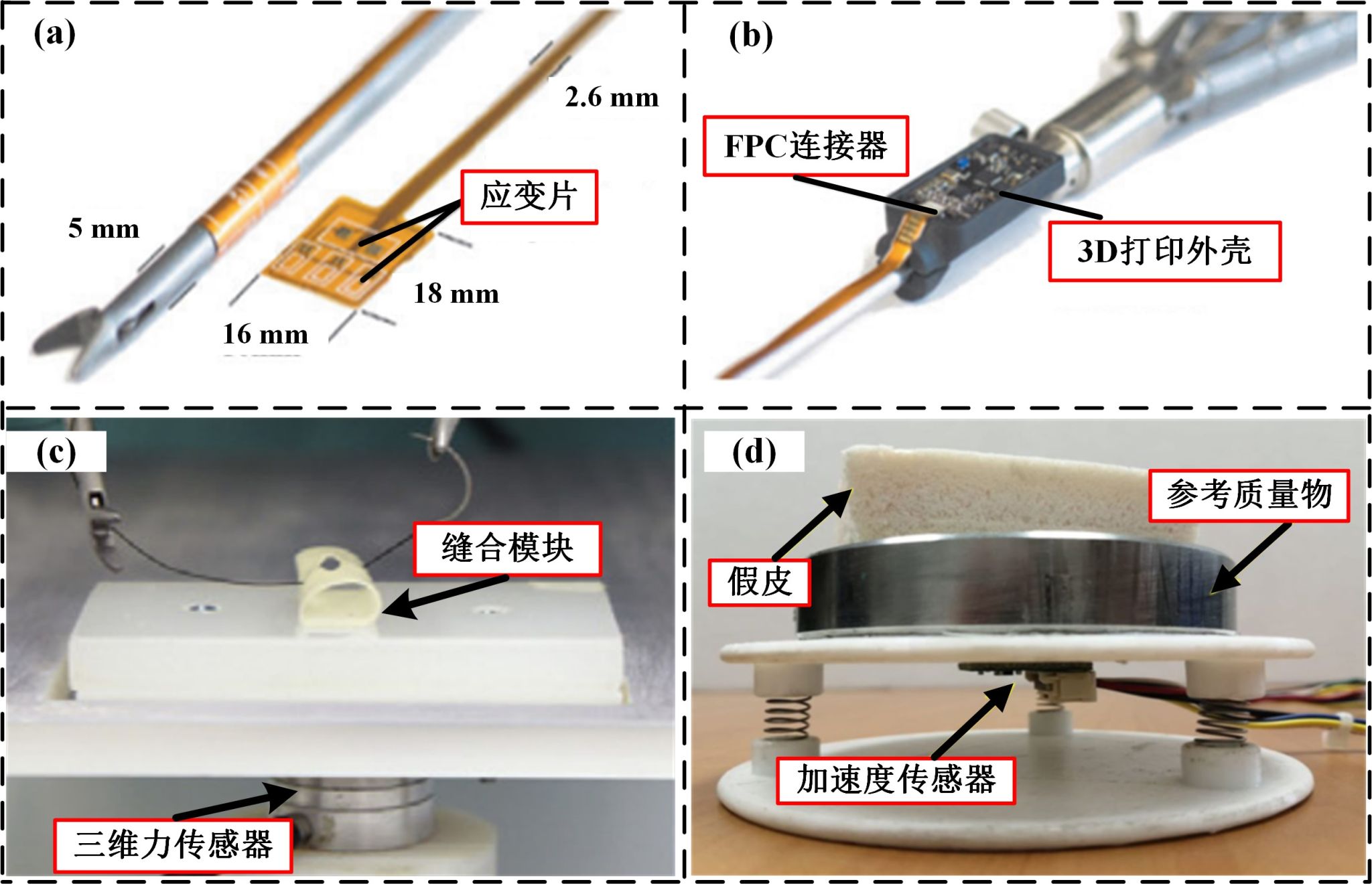 对于缝合过程中组织处理技能的评价,主要通过力传感设备收集器械与组织之间的交互力信息,并借助多个评价指标对操作技能进行客观地评价。如下图2(a)与(b)所示,其中包括三个线性应变计和一个扭矩计,并将其安装在仪器的顶端,可用于测量操作过程中手术器械末端的受力。如下图2(c)所示,研究开发出一种与现有箱式训练器结合的力传感器,可用于对手术操作中力信息的测量评估。如下图2(d)所示,利用牛顿第二定律的原理,使用加速度传感器开发出一套用于在缝合过程中测量动态力的装置,收集不同经验受试者的力信息进行技能评价,从而确保是操作过程的安全性。