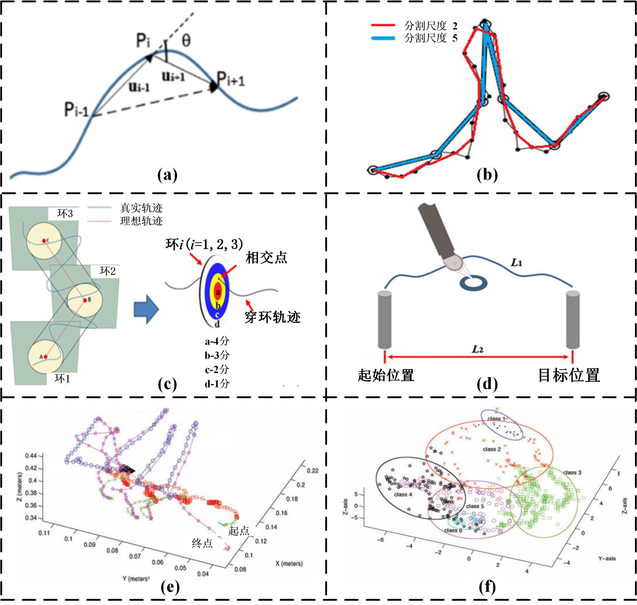 对操作过程中的运动控制技能评价,主要是利用轨迹捕捉设备收集手术器械末端的轨迹信息对操作者进行客观地评价。如下图1(a)和(b)所示,基于手术机器人末端执行器的轨迹数据,引入了转角和弯曲度新特征,来描述外科医生操作的灵活性。如下图1(c)和(d)所示天津大学团队利用自主研发的“妙手S”系统,进行单-双手的协调测试,通过对机器人末端执行器运动的运动学分析,提出了速度-精度-稳定性平衡的量化评估模型,应用基于机器人末端执行器运动的八个指标来评估操作人员的技能。