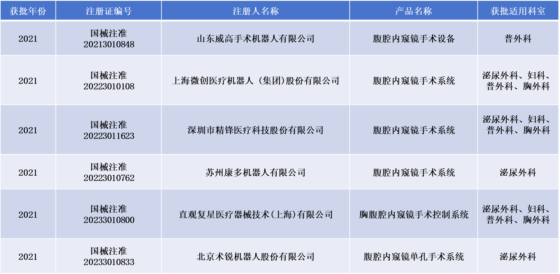 伴随着国家政策的支持以及投资的不断注入,我国越来越多的医疗企业、高校以及研究院所投入到了手术机器人的研发当中,而国内市场的局面也从完全依赖于国外进口,开始向依靠国内参与者的技术创新与自主研发转变,相应的手术机器人产品也呈现出百家争鸣、百花齐放的态势。据2020年-2023年的数据统计情况,我国手术机器人领域总共发生了过百次的融资事件,其中有多比融资金额过亿,这充分表现出手术机器人市场发展的澎湃动力与蕴藏潜能。从相关技术成果的产业化转型来看,已有50余款手术机器人产品获批国家药品监督管理局(NMPA)认证,进入临床应用阶段。以腔镜手术机器人为例,目前已经有山东威高、上海微创、深圳精锋、苏州康多、直观复星、北京术锐等多家企业的相关产品取得NMPA认证,产品覆盖普外科、泌尿外科、妇科、胸外科等多个常见科室,相信在未来有望打破达芬奇手术机器人在国内腔镜机器人市场的垄断地位,实现国产腔镜机器人研发的技术破局与产品推广。