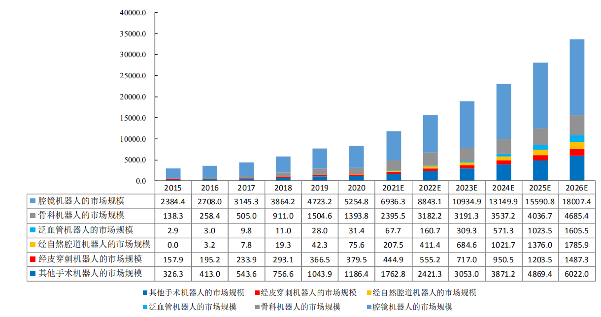 手术机器人是集机械学、医学、计算机科学、生物力学等多个学科于一体的多元化医疗器械产品,利用主从操作模式并融合多个领域的前沿技术手段,能够从视觉、触觉和听觉上对医生的手术操作提供有力支持,从而进一步增强医生的手术操作能力,延伸微创手术的应用范围,实现器械前端的灵活可达,创口的小型可入,图像的清晰可见,操作的精准可控。随着手术机器人技术的成熟,以及大众对于机器人辅助手术接受度的提升,全球手术机器人市场进入了如火如荼的发展阶段,其规模由2015年的30亿美元增长至2020年的83亿美元。预计到2026年,全球手术机器人市场规模有望达到336亿美元。