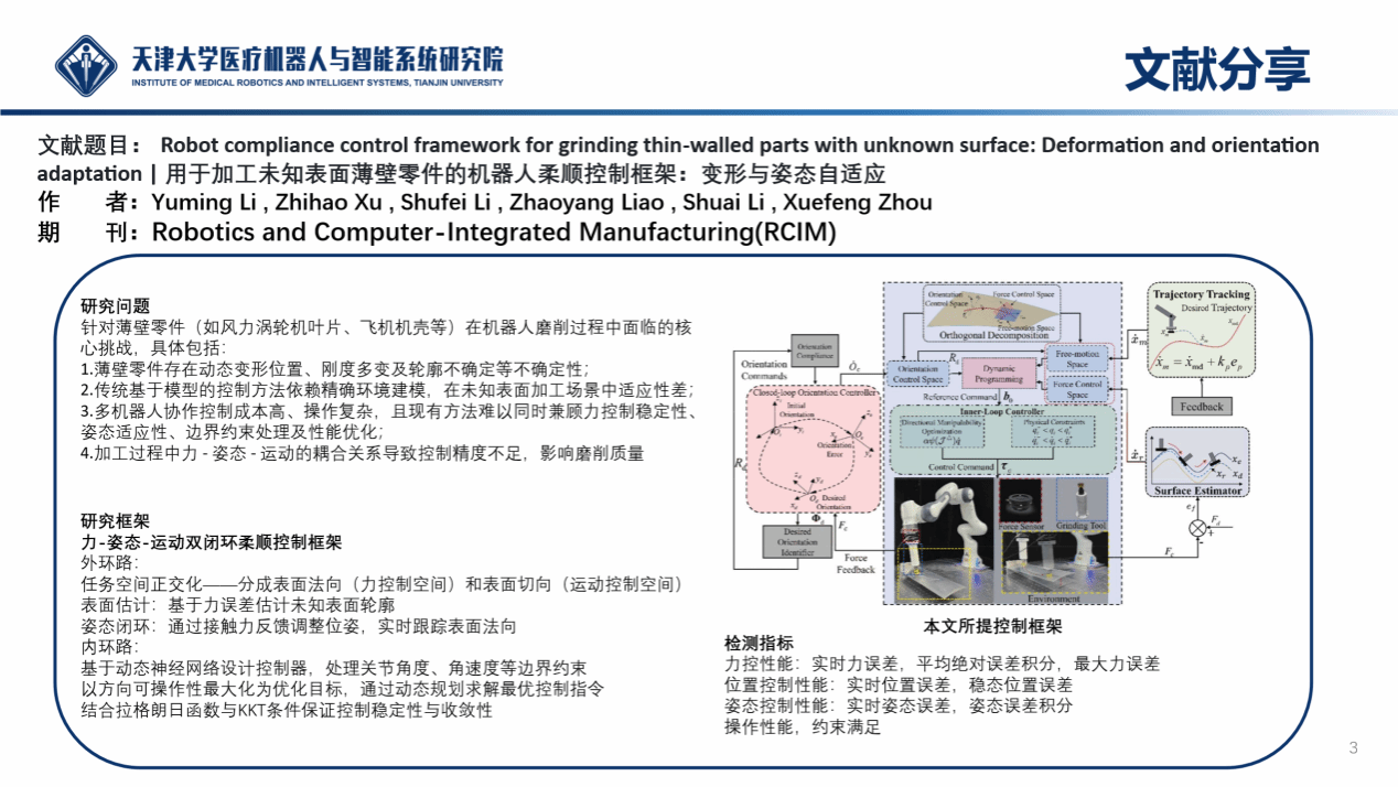 研究院2024级硕士研究生徐一鸣围绕《用于加工未知表面薄壁零件的机器人柔顺控制框架:变形与姿态自适应》进行报告分享。