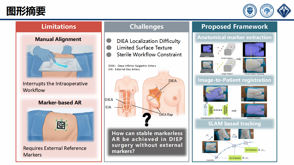 目前,增强现实(AR)导航越来越多地用于DIEP手术,将模糊的解剖结构可视化,现有方法依赖于手动步骤和辅助设备,增加了手术风险。团队创新提出自主无标记的AR框架,通过基于视频的非接触式配准方法,提取腹部表面的生物特征并与虚拟模型进行匹配,无需物理标记物或外部定位装置即可实现术前血管模型与术中腹腔表面的对齐。同时,整合视觉特征追踪与基于SLAM的姿态估计技术,实现虚拟血管模型与手术野间的持续对齐。系统已进行体模实验及前瞻性临床评估验证,证实了其术中应用可行性及减轻外科医生工作负荷的潜力。