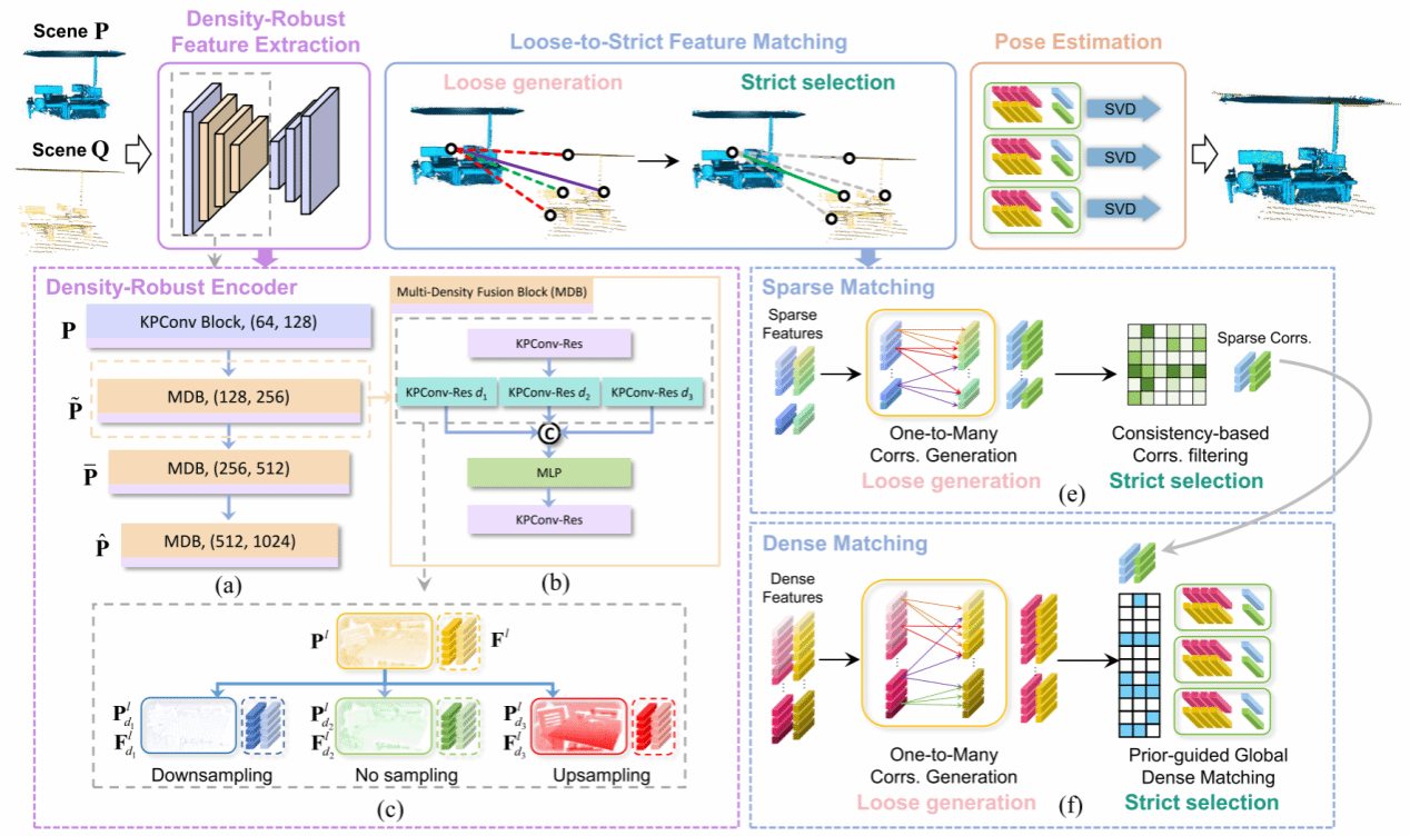 针对跨源点云因密度不一致和分布差异导致传统局部特征提取方法失效的问题,北京理工大学研究团队创新提出Cross-PCR框架。该方法设计了一种密度鲁棒编码器(DRE),通过多密度融合块(MDB)对稀疏源点云和稠密目标点云分别进行上采样、原采样和下采样,融合不同密度下的特征以提取密度不变的结构特征,有效解决了跨源数据的分布差异难题。