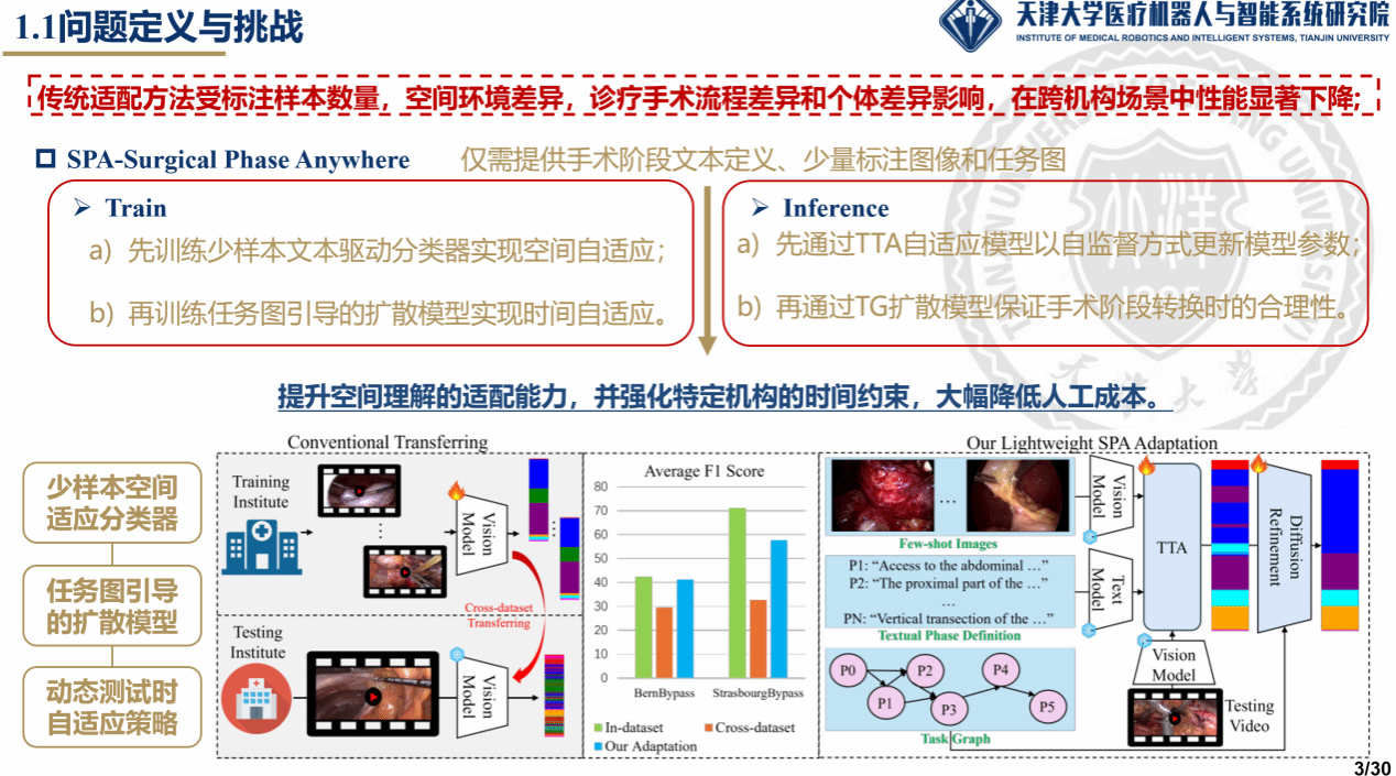受异构手术室环境、机构诊疗规程以及解剖结构个体差异的影响,手术流程的复杂性与多样性为开发具备跨机构、跨术式泛化能力的手术理解模型带来了巨大挑战。基于大规模视觉—语言数据预训练的手术基础模型已展现出良好的迁移性,但其零样本性能仍受领域偏移的制约,难以在未见过的手术环境中发挥作用。