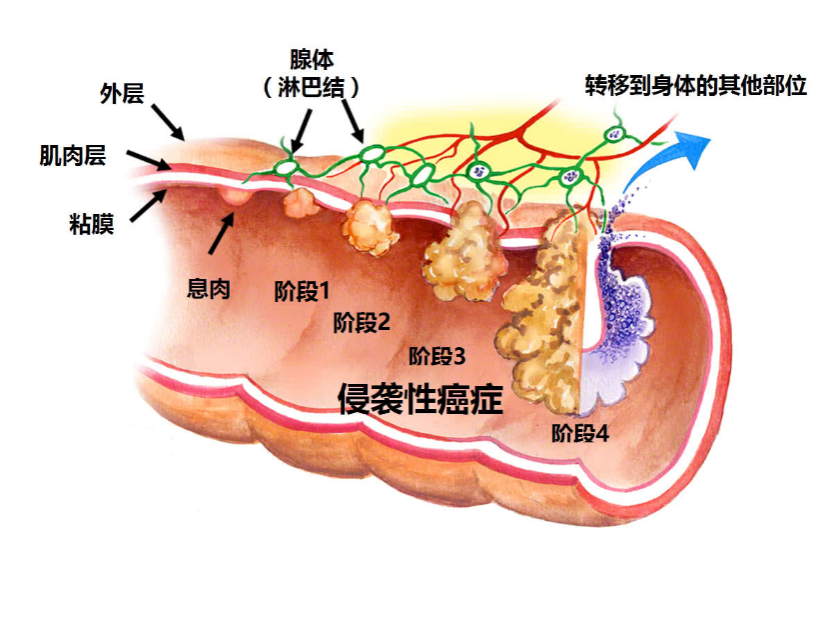 随着生活质量的提高,结直肠癌发病呈持续上升。大多数结直肠癌症起源于息肉。一系列分步进行的变异导致多年之后息肉变成癌症如图 3。当癌细胞变大时,其入侵肠壁的肌肉层,之后入侵另一内层(浆膜),之后扩散到附近的腺体(淋巴结)。结直肠镜检查的目的是其变成癌症之前去除这些息肉。